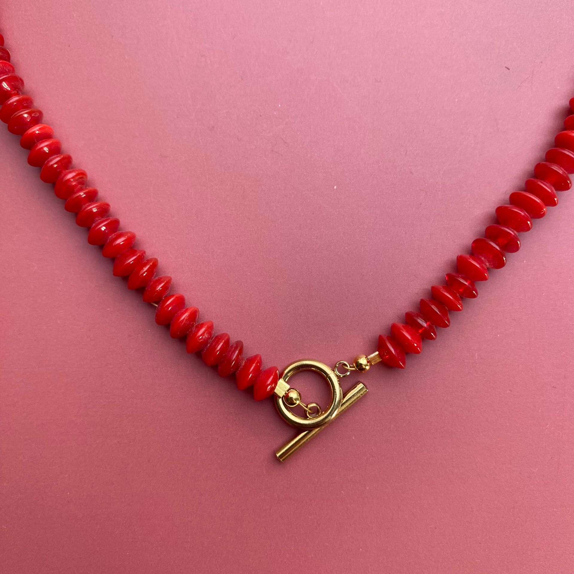 - Materiaal: glaskralen van 7 mm in discusvorm en stainless steel